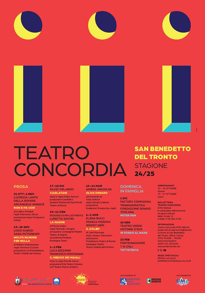 SAN BENEDETTO DEL TRONTO – Diciassette appuntamenti per dieci spettacoli da ottobre ad aprile: è un viaggio all’insegna del divertimento intelligente, della riflessione e delle emozioni quello che propone la stagione 2024-25 del Teatro Concordia di San Benedetto del Tronto promossa dal Comune con l’AMAT, il contributo della Regione Marche e del MiC e il sostegno di BIM Tronto. Il cartellone è un invito a vivere la magia dello spettacolo dal vivo nelle sue diverse declinazioni per un’esperienza a 360 gradi e si compone delle due tradizionali sezioni della Prosa e Domenica in famiglia, rassegna per un pubblico anche di bambini. Lucrezia Lante della Rovere e Arcangelo Iannace diretti da Francesco Zecca inaugurano il programma il 31 ottobre e 1 novembre con Non si fa così di Audrey Schebat. Francesca e Giulio, in apparenza, sembrano una coppia stabile e solida fino a quando Francesca, pianista di fama mondiale, tornata inaspettatamente da un viaggio di lavoro scopre che Giulio, affermato psicanalista, si prepara a commettere l’irreparabile.