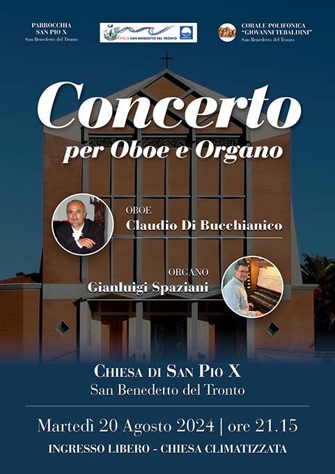 SAN BENEDETTO DEL TRONTO – Martedì 20 agosto, alle ore 21.15, presso la chiesa parrocchiale di San Pio X a San Benedetto del Tronto, si svolgerà un Concerto per oboe e organo, organizzato dalla Corale Polifonica “Giovanni Tebaldini”, tenuto dall’oboista Claudio Di Bucchianico e dall’organista Gianluigi Spaziani. Claudio Di Bucchianico è primo oboe nell’Orchestra dell’Accademia Musicale Pescarese e docente di oboe presso l’Istituto Statale di Musica di Teramo. Gianluigi Spaziani è organista di fama internazionale e lo scorso 26 dicembre 2023 ha inaugurato il nuovo organo a canne che il parroco Don Ulderico Ceroni ha voluto donare alla comunità parrocchiale di San Pio X. Molto interessante il programma che verrà eseguito, che comprende autori per lo più del periodo barocco, compreso il famoso Adagio in Sol minore di Tommaso Albinoni. Figureranno anche brani, tra i quali quelli di Johann Sebastian Bach, Arcangelo Corelli e Georg Friedrich Haendel. Il Concerto sarà l’occasione per ascoltare musiche dal sapore orecchiabile e melodie dolci e rassicuranti. Sarà certamente una serata da non perdere, l’ingresso è libero e la chiesa è climatizzata. I turisti e la città sono invitati a partecipare.