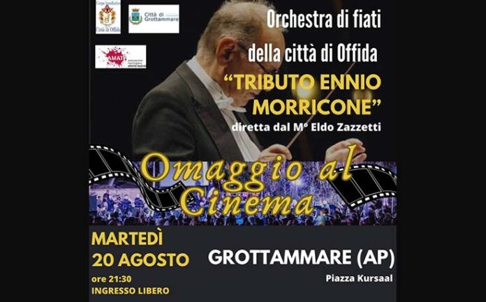 GROTTAMMARE – Una serata all’insegna della musica da film quella di martedì 20 agosto nella scenografica cornice della Piazza Kursaal di Grottammare, dove alle ore 21.30 si esibirà l’Orchestra di fiati Tributo Ennio Morricone di Offida in un concerto dedicato alle più belle colonne sonore cinematografiche di Ennio Morricone. L’orchestra diretta dal M. Eldo Zazzetti è composta da 50 musicisti, è protagonista di un’ attività concertistica in cui alterna un repertorio molto vario, dalla musica tradizionale per banda, al patrimonio operistico fino alle interpretazioni di colonne sonore dei film, come quelle composte dal grande Morricone che regaleranno al pubblico intense emozioni per capolavori assoluti e indimenticabili. «Io penso che quando fra cento, duecento anni, vorranno capire com’eravamo, è proprio grazie alla musica da film, che lo scopriranno.», le parole del Premio Oscar Ennio Morricone, scomparso nel 2020, risuonano, quanto la sua musica, ai nostri giorni.  La scaletta del concerto vede l’inserimento di molti titoli: Mission, Cinema Paradiso, Gli intoccabili, La Califfa, C’era una volta in America, Saharan dreams, Mesa verde-Giù la testa, Come una sentenza-c’era una volta il West, A fistful of dollars, A Morricone portrait, Il buono il brutto e il cattivo, L’estasi dell’oro, con arrangiamenti che ne esaltano la straordinaria bellezza. Nel corso della serata “Omaggio al cinema” saranno eseguiti anche Così Parlò Zarathustra (2001 Odissea nello spazio), La strada/Amarcord, Valzer Brillante (Il Gattopardo), Gladiator, I Will Always Love You (La guardia del corpo), Pirati dei Caraibi, My Heart Will Go On (Titanic) e Ciao Albertone (Film di Alberto Sordi). Ospiti speciali le vocalist Valeria Svizzeri e Valentina Cinquino, ad accompagnare il pubblico Mauro Moretti. Si tratta della formazione giusta per farsi accompagnare nell’incredibile viaggio tra le melodie che sono rimaste nella memoria collettiva di generazioni. L’ingresso è libero senza prenotazione.