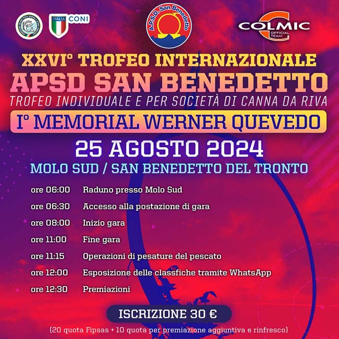 SAN BENEDETTO DEL TRONTO – L’Apsd San Benedetto Colmic organizza domenica 25 agosto al Molo Sud di San Benedetto la ventiseiesima edizione del Trofeo internazionale di canna da riva – I Memorial Werner Quevedo, storico garista nella specialità della canna riva e nonno del rossoblù Tiziano Quevedo. La gara prevede una classifica finale riservata agli individuali e un’altra per le società di canna da riva e inizierà alle ore 6 con il raduno dei concorrenti al Molo Sud di San Benedetto, location storica della manifestazione, peraltro molto gradita a tutti i pescatori, che ogni anno accorrono da ogni parte d’Italia per partecipare alla gara. L’organizzazione è curata dall’Apsd San Benedetto del presidente Zefferino Guidi, con la collaborazione di Colmic, della Fipsas (Federazione italiana pesca sportiva e attività subacquee) e del Coni. «Ringraziamo – ha detto il presidente Guidi – la Capitaneria di Porto di San Benedetto, l’Autorità di Sistema Portuale del Mare Adriatico Centrale e l’amministrazione comunale di San Benedetto». Hanno reso possibile la realizzazione della gara le aziende Picchio Gronde, Flora Madre, Baiocchi Group, Alba Pesca di Legname Luigi, Biometabolic, The Shark idee per la pesca, Conad Alba Adriatica e Tortoreto, Antica gastronomia delle Marche, Zetaemme fishing, Colmic, Salpi, New Vanità, Forno SanGiò, Conad San Benedetto zona San Filippo Neri e Ristorantino di pesce La Stiva.