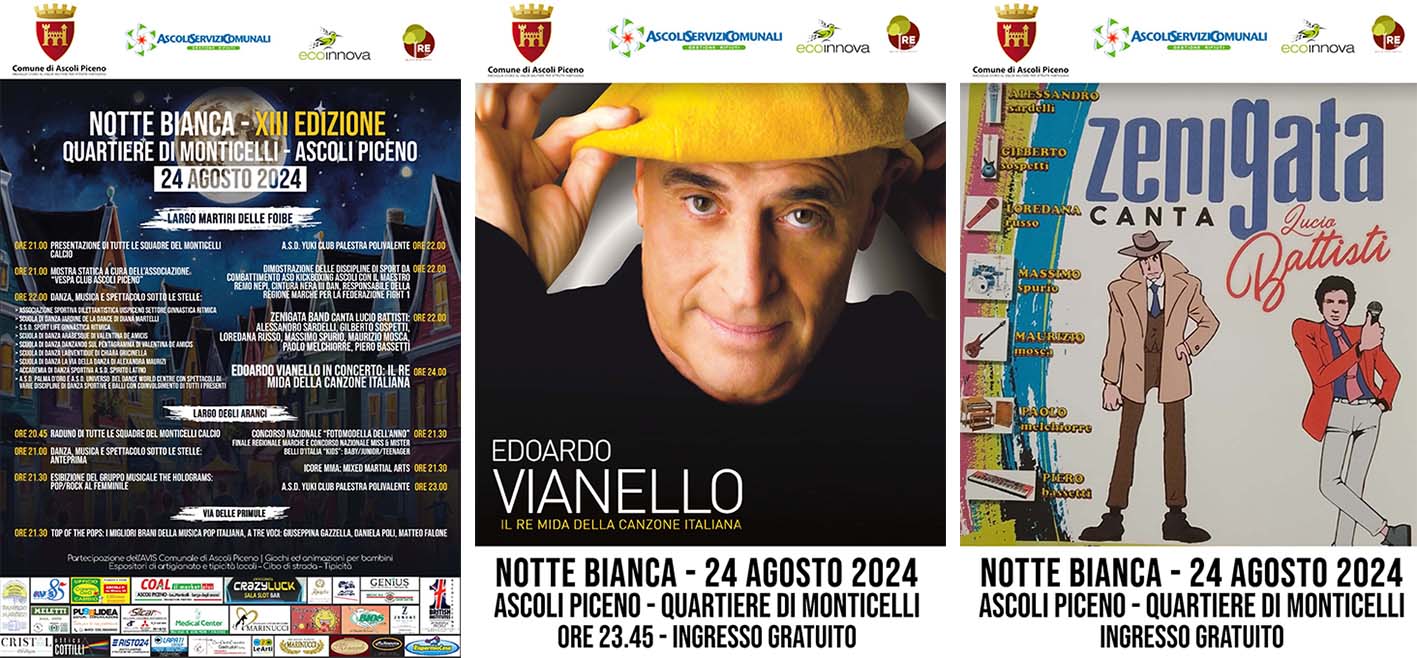 ASCOLI PICENO – Sabato 24 agosto torna l’appuntamento con la XIII edizione della “Notte Bianca” nel quartiere di Monticelli. Quest’edizione avrà come ospite Edoardo Viannello, “il Re Mida della canzone italiana”, oltre a tanti spettacoli che, dalle ore 20.30 alle 02.00, animeranno Largo Martiri Delle Foibe, Largo Degli Aranci e Via Delle Primule. «Anche quest’anno – ha dichiarato il sindaco Marco Fioravanti – la Notte Bianca si è fatta in quattro: dopo quelle di Borgo Solestà, centro storico e Porta Maggiore, ecco l’appuntamento a Monticelli. Abbiamo voluto confermare questo evento che permette di animare un quartiere molto popoloso, dando così un’occasione di svago per grandi e piccoli». Ballerini di varie discipline, gruppi musicali, attrazioni per bambini e il concorso nazionale “Fotomodella dell’anno” – finale regionale Marche – saranno protagonisti della serata, che sarà aperta dalla presentazione di tutte le squadre del Monticelli Calcio. Molte le scuole di danza, di ballo e di altre discipline che si esibiranno:Asd Uispiceno settore ginnastica ritmica, Accademia di danza sportiva Spirito Latino, Scuola di danza Jardine de la Dance di Diana Martelli, Ssd Sport Life ginnastica ritmica, Scuola di danza Arabesque di Valentina De Amicis, Scuola di danza Danzando sul pentagramma di Annarosa Piacenti, Scuola di danza Labventidue di Chiara Gricinella, Scuola di danza La via della danza di Alexandra Maurizi, Asd Palma d’oro e Asd Universo del Dance World Centre, dimostrazione delle discipline di sport da combattimento Asd Kickboxing Ascoli con il Maestro Remo Nepi, Asd Yuki Club palestra polivalente, Icore MMA: Mixed Martial Arts. Non mancherà la musica dal vivo con i gruppi “Zenigata canta Battisti”, “The Holograms: pop/rock al femminile” e “Top of the pops”, i migliori brani della musica pop italiana a tre voci con Giuseppina Gazzella, Daniela Poli e Matteo Falone. Tantissime le attrazioni e giochi per bambini, oltre naturalmente a cibo di strada, tipicità, artigianato e curiosità, compresa una mostra statica a cura dell’associazione Vespa Club Ascoli Piceno. La manifestazione, patrocinata dal Comune di Ascoli Piceno, è stata realizzata grazie ai main sponsors Ascoli Servizi Comunali ed Ecoinnova, oltre a tutti gli altri sponsor che hanno sostenuto l’iniziativa.