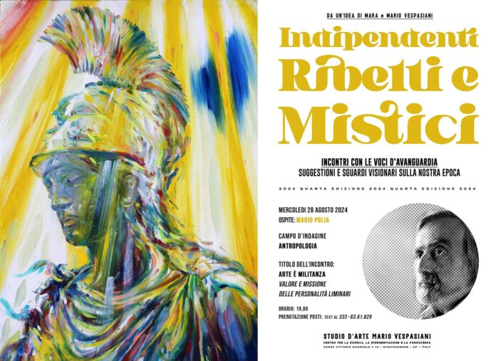 Un argomento che è a cuore all’artista Vespasiani, in quanto fin dagli esordi si è distinto per aver mantenuto fede a determinati principi, gli stessi che nei secoli hanno guidato i maggiori maestri d’arte nell’espressione dei più alti contenuti, ossia nel fare ciò che deve essere fatto, ponendosi al servizio della fonte da cui scaturisce bellezza e verità. Le personalità liminari di cui si farà riferimento sono coloro che rispettando la propria identità d’appartenenza hanno oltrepassato le barriere temporali e geografiche per diventare dei riferimenti assoluti e la cui opera pionieristica non di rado ha fatto evolvere l’intera umanità. La presenza dell’antropologo Mario Polia in questo ciclo di incontri intitolati “Indipendenti, Ribelli e Mistici” conferma il prestigio di questa rassegna, che per l’inedita impostazione strutturale e per la particolarità dei contenuti è già stata definita come il più originale laboratorio di cultura in Italia.