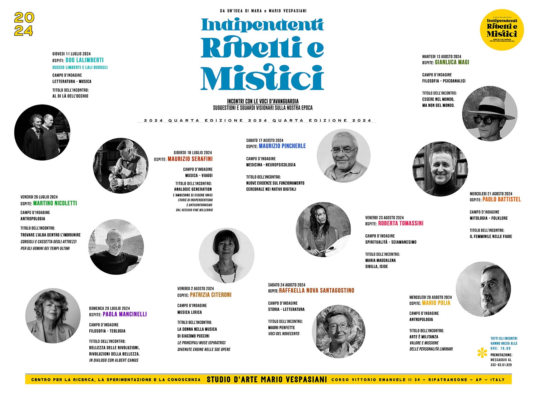 Indipendenti, Ribelli e Mistici è un progetto di interscambio umano che nel corso degli anni si è affermato tra i principali eventi nazionali nell’ambito della cultura, attraendo numerose tra le menti più fervide e libere del pensiero contemporaneo. Tra luglio ed agosto sono stati vari ed eterogenei gli argomenti trattati come i protagonisti coinvolti: Duccio Limberti – compositore toscano non vedente insieme a Lali Burduli, il musicista e scrittore Maurizio Serafini, l’antropologo Martino Nicoletti, la professoressa Paola Mancinelli, l’esperta di musica lirica Patrizia Citeroni, il filosofo e psicoanalista Gianluca Magi, il neuropsichiatra Maurizio Pincherle, lo scrittore Paolo Battistel, la ricercatrice Roberta Tomassini e la scrittrice Raffaella Nova Santagostino.