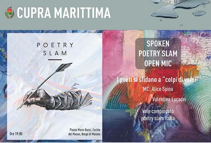 CUPRA MARITTIMA – Nell’ambito del Festival “Marche il dono dell’infinito. Rotte poetiche marchigiane e mediterranee” ricordiamo Poetry Slam Italia, domenica 8 settembre ore 19, presso Piazza Mario Bucci, Cortile del Museo, Borgo di Marano, a cura dell’Associazione Bohemian Art in collaborazione con la Biblioteca comunale di Cupra Marittima, l’Amministrazione Comunale e la Direzione Artistica del Festival. Nella splendida cornice del Borgo di Marano a Cupra Marittima, avrà luogo un’incursione poetica performativa all’insegna della bellezza e cura all’ascolto. Maestro di cerimonie (MC) e coordinamento sarà la fondatrice del Bohemian Art, Alice Spina in collaborazione con Valentina Lucadei. Il maestro di cerimonie avrà il compito di condurre la sfida iniziando con un incipit poetico che consiste nella declamazione di un proprio testo. In sinergia ad uno speciale check e fiore all’occhiello con Lucilio Santoni, di buon auspicio per i poeti in gara. Il tutto dopo aver ricordato quali sono le regole del gioco, perché di fatto di un gioco si tratta, e avere organizzato il succedersi dei poeti avendo individuato la giuria popolare. Il vincitore dell’incontro parteciperà alla finale di Poetry Slam Italia il 21 settembre al Parco Trotter di Milano.