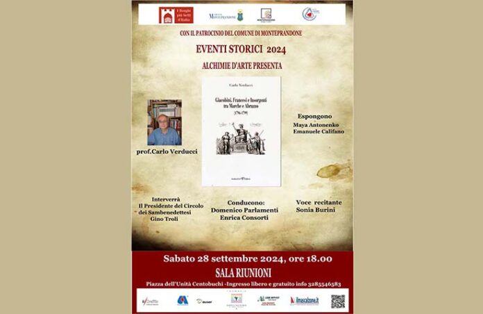 MONTEPRANDONE – Per la rassegna storica di Alchimie d’Arte 2024 ci sarà Carlo Verducci e la sua ultima opera storica dal titolo “Giacobini, Francesi e Insorgenti tra Marche e Abruzzo” (1796-1799), Andrea Livi editore. L’evento si svolgerà sabato 28 settembre, alle ore 18, presso la Sala Riunioni di Piazza dell’Unità a Centobuchi. L’evento come sempre è patrocinato dal Comune di Monteprandone e si avvale delle collaborazioni di Avis Monteprandone e Auser insieme Monteprandone. Con gli sponsor Farmacia San Giacomo di Fabrizio Roncarolo e Code Service di Lino Damiani. Interverrà il prof. Gino Troli, Presidente del Circolo dei Sambenedettesi, scrittore, storico, autore di testi sulla storia e sulla cultura cittadina. Troli è stato anche presidente dell’Amat e assessore alla cultura prima del Comune di San Benedetto del Tronto e poi alla Regione Marche. L’evento sarà condotto da Domenico Parlamenti e da Enrica Consorti d’Arte. La voce recitante sarà quella Sonia Burini. Gli artisti che esporranno nel corso della serata sono Maya Antonenko e Emanuele Califano Lidak. L’ingresso è libero. Info: 3284682561.