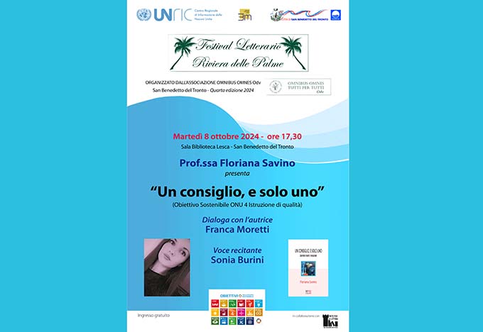 SAN BENEDETTO DEL TRONTO – Oggi, martedì 8 ottobre, alle ore 17.30, terzo evento per il Festival Letterario Riviera delle Palme curato dalla Omnibus Omnes OdV, con la Prof.ssa Floriana Savino e la sua opera “Un consiglio, e solo uno”. La location del Festival è la sala della Biblioteca Comunale Lesca di San Benedetto, con il patrocinio del Comune di San Benedetto del Tronto e del Patto per la Lettura, e il patrocinio del Centro Regionale di Informazione delle Nazioni Unite di Bruxelles, grazie alle tematiche sociali e culturali attualissime incentrate sugli Obiettivi Sostenibili ONU e l’Agenda 2030. Il nuovo incontro, all’insegna dell’Obiettivo Sostenibile 4 Istruzione di qualità, vedrà Floriana Savino, docente di Storia dell’Arte Moderna presso la LABA di Rimini, presentare la sua opera “Un consiglio, e solo uno. Sentieri d’arte e passione”: integrando e dando spazio a frammenti di identità e vissuto, l’opera muove nella possibilità del ricordo, nell’impegno di farne una costante socialmente utile. Narra della vita, del suo dialogo con l’arte, e così delle potenzialità che quest’ultima possiede nel planare, fino ad abbattere, muri e barriere. Andando dalla fotografia di Richard Mosse, Letizia Battaglia e Lisetta Carmi, il saggio ragiona sulla bellezza di un fare, che sa dar voce alla preziosità di considerarsi solo una piccola parte di un tutto, maestoso e solidale. Riccardo Dalisi e le periferie di città, Hélio Oiticica e la favela, Maria Lai e il sogno della comunità, sono solo alcune delle schegge luminose che questo piccolo memoir con passione consegna alla carta, alla sua più pura e libera emozione. Dialogherà con l’autore Franca Moretti, e interverrà l’attrice Sonia Burini con l’interpretazione di alcuni brani. Quello dell’8 ottobre è il terzo dei dieci incontri della quarta edizione del Festival Letterario Riviera delle Palme, organizzato dalla Omnibus Omnes Organizzazione di Volontariato di San Benedetto del Tronto. La Omnibus Omnes sta portando avanti le tematiche degli Obiettivi Sostenibili ONU sia nel Festival, sia nel Premio Letterario Internazionale Charles Dickens, sia nel Concorso per gli Obiettivi Sostenibili ONU nelle scuole del territorio.