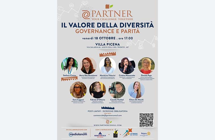 COLLI DEL TRONTO – L’argomento “Il valore della diversità – Governance e parità” sarà al centro della tavola rotonda in programma venerdì 18 ottobre, alle ore 17.30, presso Villa Picena, a Colli del Tronto. Si tratta di un evento dedicato in modo particolare alle donne in azienda, organizzato dalla Partner your challenge together in collaborazione con Nicoletta Traini di Banca Mediolanum e con il Rotary Club Hatriaticum Piceno, La magia del Rotary, Manager Italia Emilia Romagna, Pari Opportunità. Per riflettere insieme sull’argomento della governance equilibrata ed inclusiva, che non è solo questione di giustizia sociale, ma un fattore chiave per la crescita e la sostenibilità aziendale, mentre includere diverse prospettive nei processi decisionali migliora l’efficienza e la creatività. Dunque, per avere uno sguardo ad un futuro più inclusivo, moderatrice Stefania Cimino, executive professional e consulente, che guiderà le ospiti nel racconto delle loro esperienze di vita e professionali per scoprire come trasformare la diversità di genere in un vantaggio competitivo per le aziende, interverranno l’antropologa giuridica, docente e counselor Maria Rita Bartolomei, la presidente Commissione pari opportunità Marche Maria Lina Vitturini, la presidente Manager Italia Emilia Romagna Cristina Mezzanotte, la socia e responsabile amministrativa dell’azienda agricola Emidio Pepe, Daniela Pepe, e ancora, Ilaria Capponi presidente cooperativa sociale Lella 2001, Fabrizia D’Ottavio argento olimpico in ginnastica ritmica, Caecilie Hechtel, direttore generale della Covalm Orto Verde e Chiara De Marchi, divulgatrice scientifica e content creator. L’ingresso libero, con prenotazione obbligatoria al numero telefonico 327 1164160 (Nicoletta Traini).