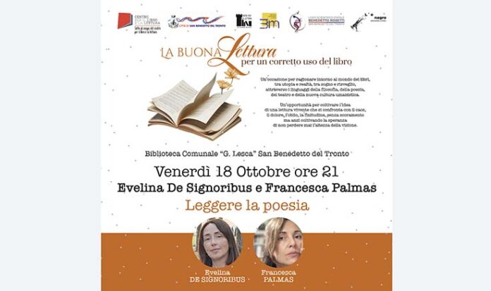 SAN BENEDETTO DEL TRONTO – Dopo il grande successo che la manifestazione ha avuto con Vito Mancuso che ha parlato di filosofia, “La buona lettura” prosegue venerdì 18 ottobre alle ore 21, presso la Biblioteca Lesca, con Evelina De Signoribus e Francesca Palmas che parleranno di come e perché “Leggere la poesia”. La mattina successiva De Signoribus e Palmas incontreranno gli studenti del Liceo Rosetti. Ricordiamo che venerdì 25 e sabato 26 ottobre il ciclo di incontri si chiuderà con Giorgio Colangeli con una conferenza-spettacolo dal titolo: “La lettura è come il pane: nutrimento terrestre e celeste”. “La buona lettura” è un luogo privilegiato, per studenti, insegnanti e cittadini, affinché possano vivere esperienze di lettura comunitarie e formative.Uno spazio di convivialità volto a far crescere la città educandola al corretto uso del libro. Infatti, obiettivo importante della manifestazione è quello di ribadire l’importanza del libro e della lettura tradizionali come base per poter poi affrontare qualsiasi altro tipo di lettura, incluso quello su supporto digitale oggi predominante. Gli incontri serali in Biblioteca sono a ingresso libero fino a esaurimento posti. Gli incontri presso il Liceo sono riservati agli studenti. La manifestazione, organizzata dall’Associazione L’Onagro, va sotto gli auspici del Centro per il Libro e la Lettura del Ministero della Cultura, ed è sostenuta dal Comune di San Benedetto e dal Liceo Scientifico “B.Rosetti”.
