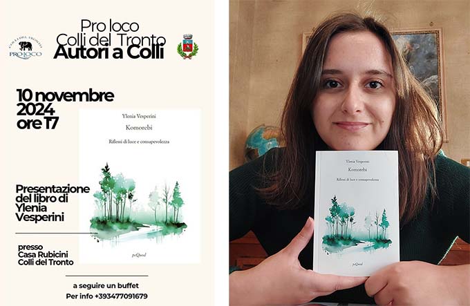 COLLI DEL TRONTO – Domenica 10 novembre alle ore 17, presso la “Casa Rubicini” in Via Carlo Levi 2, a Colli del Tronto, si terrà la presentazione del libro “Komorebi. Riflessi di luce e consapevolezza” scritto da Ylenia Vesperini e pubblicato dall’Editore PeQuod nel 2023. Si tratta di una raccolta poetica che, attraverso un insolito e raro stile narrativo, riflette su varie tematiche sentimentali, etiche, religiose, sociali. La versificazione lunga e iterativa richiede attenzione al lettore e la richiederà anche al pubblico, quello collese, ma non solo, che da sempre segue con affetto le presentazioni di libri che la Pro Loco truentina propone ormai da tempo. Il titolo del libro, con il suo sottotitolo, rimanda ad una presa di coscienza che avviene per riflesso, come può accadere in una foresta attraversata dal sole o meglio in una radura. Questo è del resto evocato anche dalla bellissima copertina, minimalista ed essenziale, bianca con disegni in verde raffiguranti un bosco  stilizzato. Ylenia Vesperini, giovanissima poetessa di origini laziali, ma ora residente nelle Marche, ci offre una prima raccolta poetica che è già matura per tematiche e per stilistica. Modereranno l’incontro Filomena Gagliardi e Daniela Amatucci. L’evento rientra nel progetto, ormai ben consolidato, “Autori a Colli” che intende promuovere autori locali, ma non solo. Sono infatti in lavorazione nuove iniziative e nuove collaborazioni, merito di una Pro Loco, quella collese, davvero attiva e propositiva sul piano culturale.