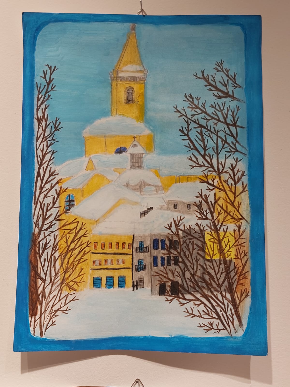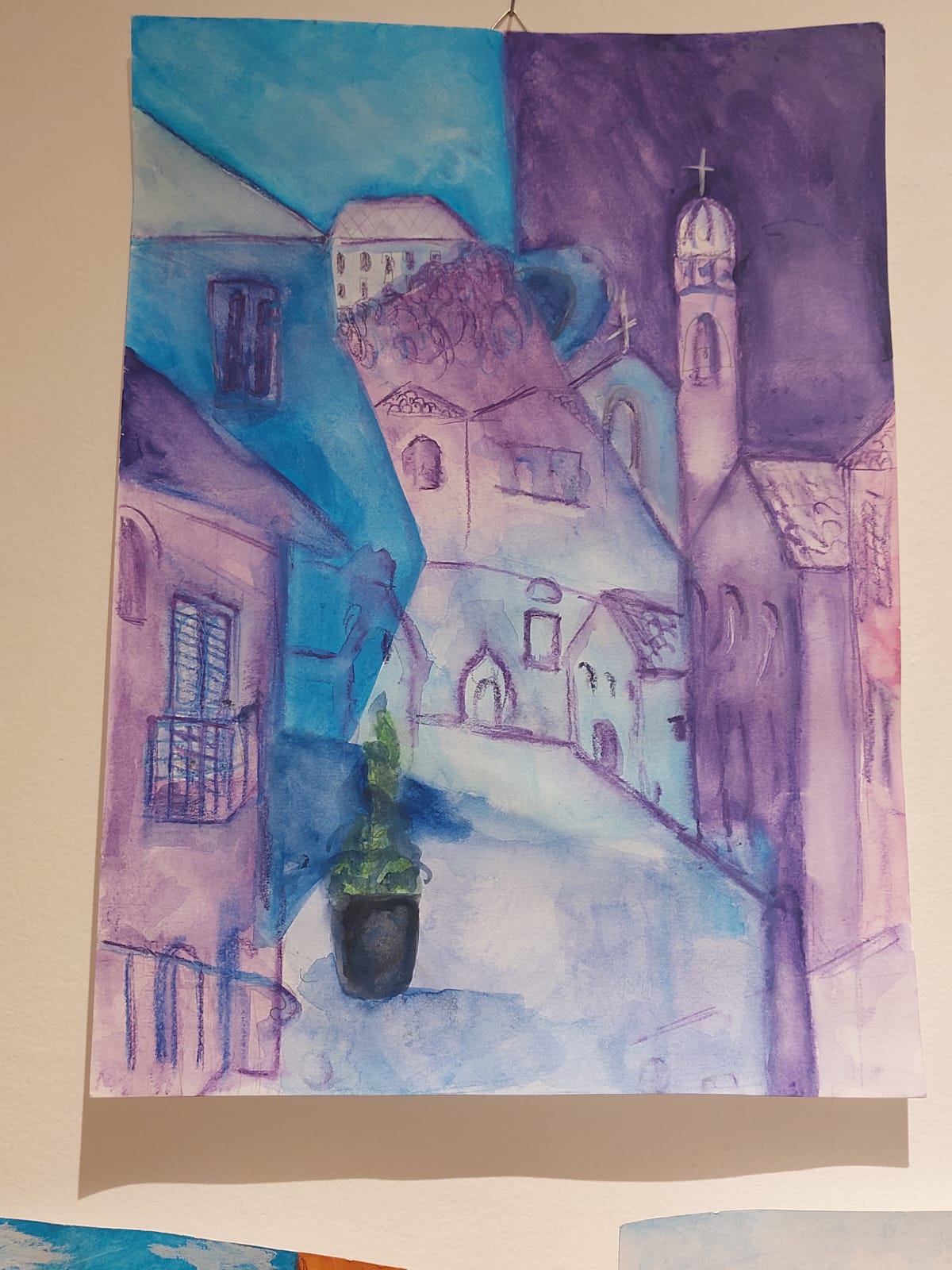 “Uno spaccato del centro storico interpretato in maniera personale. Le figure in primo piano si mescolano con lo sfondo, grazie all’impiego della prospettiva multipla e a un uso del colore  molto espressivo”