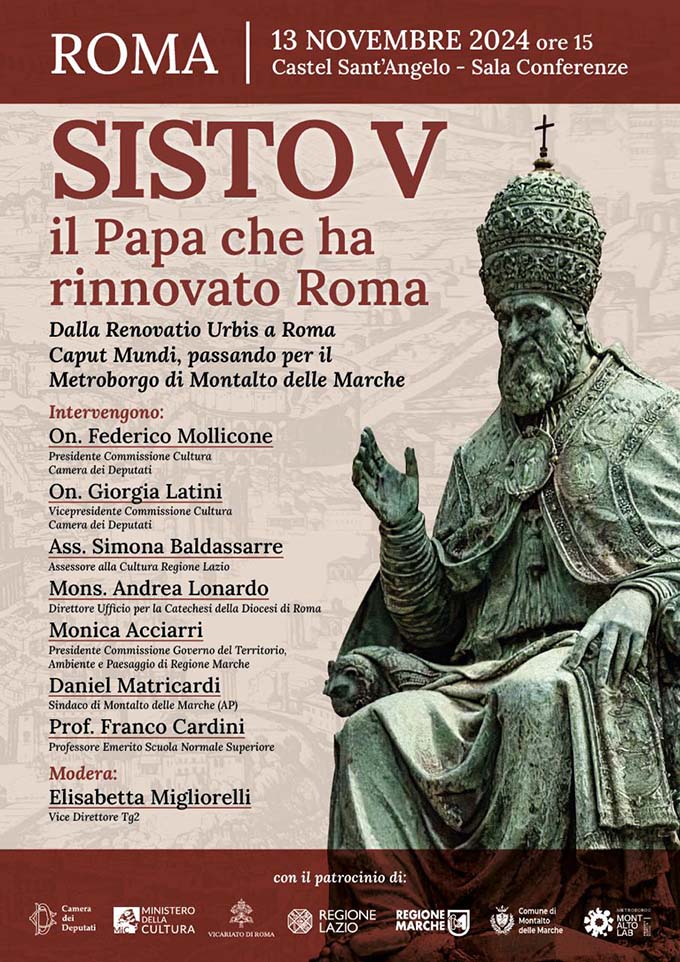 ROMA – Mercoledì 13 novembre alle ore 15 a Roma, presso la Sala conferenze di Castel Sant’Angelo, si svolgerà il convegno dal titolo “Sisto V, il Papa che ha rinnovato Roma. Dalla Renovatio Urbis a Roma Caput Mundi, passando per il metroborgo di Montalto delle Marche”. L’evento, promosso dalla vicepresidenza della Commissione Cultura della Camera dei Deputati e patrocinato, tra gli altri, dal Ministero della Cultura, Regione Lazio, Regione Marche, è realizzato nell’ambito della mostra “Papi e Santi marchigiani a Castel Sant’Angelo”. L’appuntamento rappresenta un’importante occasione, in prossimità del Giubileo 2025 e dei nuovi interventi infrastrutturali avviati, per riscoprire la figura di Felice Peretti e ripercorre la complessa trasformazione urbanistica della Città Eterna voluta dal papa marchigiano al tempo del Giubileo del 1600, consolidandola come modello di riferimento per le grandi capitali europee.