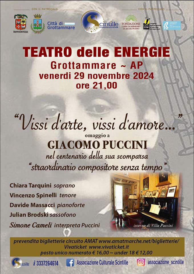 Venerdì 29 novembre, alle ore 21, presso il Teatro delle Energie, l’associazione culturale “Scintille” omaggia Puccini con un concerto per celebrare il genio del compositore e valorizzare i giovani talenti –