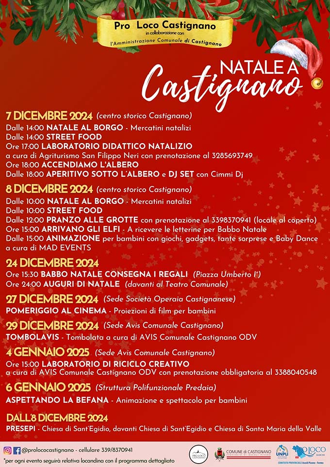 Domenica 8 dicembre: Letterine agli Elfi e Animazione per Bambini. I bambini avranno la possibilità di consegnare le letterine per Babbo Natale agli elfi, pronti a raccogliere i loro sogni edesideri. A partire dalle ore 15, Piazza Umberto I sarà arricchita da giochi e tante sorprese grazie all’animazione a cura di Mad Events, per far vivere ai piccoli un pomeriggio di puro divertimento. Il 24 dicembre, il Natale a Castignano diventerà ancora più speciale con l’arrivo di Babbo Natale, che, alle ore 15.30 in Piazza Umberto I, consegnerà i regali ai bambini del paese. Il 27 dicembre,presso la sede della Società Operaia Castignanese, si terrà la proiezione di film per bambini e ragazzi.