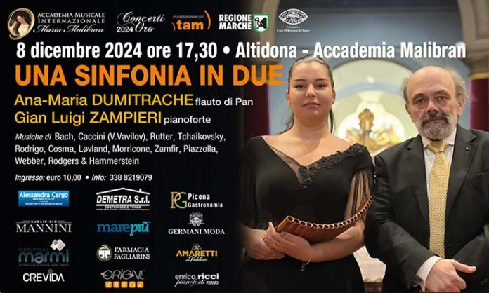 ALTIDONA – Nuovo straordinario appuntamento con i Concerti Oro dell’Accademia Malibran. Domenica 8 dicembre, in occasione dell’Immacolata, alle ore 17.30, presso la Sala Colonna dell’Accademia Malibran di Altidona,  si terrà il concerto intitolato “Una Sinfonia in Due”.