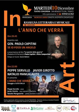SAN BENEDETTO DEL TRONTO – Al via la VII edizione della rassegna letteraria e musicale In Art, raffinata kermesse organizzata dall’associazioneculturale Rinascenza con la direzione artistica di Annalisa Frontalini. Appuntamento martedì 10 dicembre alle 20.45 al Teatro Concordia di San Benedetto del Tronto con la serata intitolata “L’anno che verrà”, che vedrà susseguirsi sul palco il Generale Paolo Capitini e i musicisti Peppe Servillo, Javier Girotto e Natalio Mangalavite. Il Generale Paolo Capitini alle 20.45 aprirà la serata con l’incontro “Se io fossi un angelo”, dedicato a temi di attualità, e presenterà il libro “Le parole della Guerra” (Parabellum & Partners), scritto insieme a Mirko Campochiari. Dialogherà con l’autore l’avvocato e poeta Gianni Balloni. La serata continuerà alle ore22 con i musicisti Peppe Servillo (voce), Javier Girotto (sax soprano e baritono) e Natalio Mangalavite (piano, tastiere e voce), che omaggeranno Lucio Dalla con il concerto “L’anno che verrà”. L’Associazione culturale Rinascenza ringrazia il Comune di San Benedetto del Tronto per il patrocinio e il sostegno, e gli sponsor che hanno preso parte all’iniziativa. L’ingresso è libero. É gradita un’offerta consapevole. Informazioni e prenotazioni dopo le ore 18: 3394211362.
