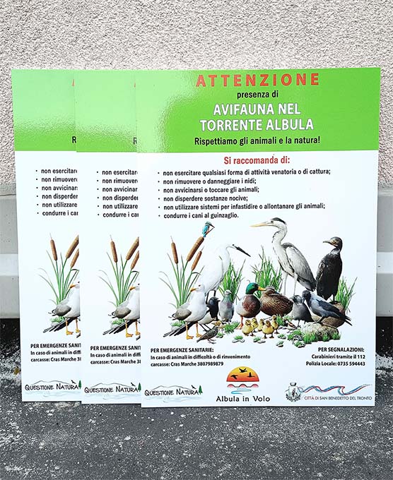 SAN BENEDETTO DEL TRONTO – “Albula in Volo”, un’associazione di volontari attiva da qualche settimana e presente con un gruppo social Instagram e Facebook, ha posizionato, d’intesa con l’Amministrazione comunale, in tre punti strategici, ben visibili, di accesso all’alveo del torrente Albula tre cartelli di segnalazione. Il primo si trova a fianco alle scalette di via Piemonte; il secondo si trova immediatamente dopo la collinetta alla foce dell’Albula, di fianco alla fontanella; il terzo è invece, in cima alla scalinata che conduce alla palestra e, subito dopo, alla spiaggia. «L’iniziativa ha l’obiettivo di tutelare le anatre e le altre specie avicole e di coinvolgere i cittadini nel rispetto della fauna del nostro torrente. – spiega Cristian Spinozzi, fondatore del gruppo “Albula in Volo” – Non sono da dimenticare i numerosi incidenti che hanno coinvolto questa colonia di anatre: investimenti stradali, furto di uova con fini ignoti, furto di numerosi esemplari di anatre durante le ore notturne, anatre smembrate da cani senza guinzaglio, abbandono di mangime velenoso lungo il tragitto che porta alla foce dell’Albula. Questa serie di episodi si è ripetuta più di una volta nel corso dei due anni di permanenza di questi volatili e rischia di ripetersi se i cittadini di San Benedetto del Tronto non prenderanno consapevolezza dell’opportunità che questi animali offrono per riplasmare il futuro dell’alveolo. Un grazie di cuore a tutti coloro che vorranno prestare attenzione a questa realtà».