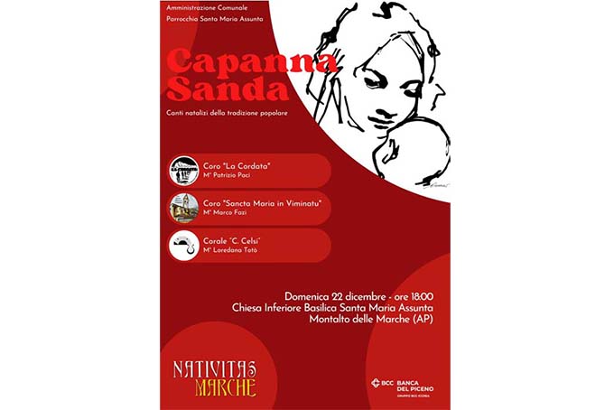 MONTALTO DELLE MARCHE – Capanna Sanda, potrebbe sembrare un errore grammaticale, invece è la storpiatura dialettale di una frase del canto popolare natalizio marchigiano più conosciuto “Natu natu Nazzarè”, recuperato dall’etnomusicologo maceratese Giovanni Ginobili nelle campagne di San Severino Marche e armonizzato per il celebre Coro della Sat di Trento da Lino Liviabella negli anni ‘50. Il messaggio spontaneo del popolo settempedano è riassunto appunto con le semplici parole: «Capanna Sanda, ndo’ che che ci stà Gisù se sona e canda». Come dire dove c’è Gesù c’è gioia e voglia di vivere. Il Coro “La Cordata” di Montalto Marche e il Coro “Sancta Maria in Viminatu di Patrignone, nell’organizzare la ventesima edizione di Canti Natalizi della Tradizione Popolare, hanno scelto questo passo, come suggestivo e immediato titolo della manifestazione, inserita nella più ampia ottica del “Nativitas Marche”, un calendario regionale di eventi corali legati al Natale, curato dall’Arcom (Associazione Regionale Cori Marchigiani), in collaborazione con vari enti locali, in questo caso l’Amministrazione Comunale, la Parrocchia Santa Maria Assunta e l’Avis. Nella Cripta della Cattedrale Santa Maria Assunta di Montalto Marche, dove è possibile visitare un artistico presepe permanente, domenica 22 dicembre alle ore 18 si esibiranno i seguenti cori: Coro “La Cordata” Montalto Marche (AP) diretto dal M° Patrizio Paci; Coro “Sancta Maria in Viminatu” Patrignone (AP) diretta dal M° Marco Fazi; Corale “C. Celsi” Falerone (FM) diretta dal M° Loredana Totò.