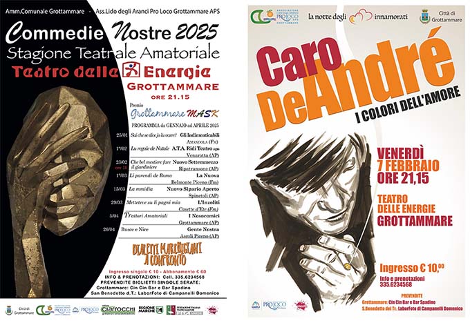 Ma l’Associazione Lido degli Aranci non si ferma qui, perché ha già in cantiere con una prevendita allo stesso modo della Rassegna di “Commedie Nostre” più che avviata, la serata dedicata agli innamorati, prevista per venerdì 7 febbraio, sempre al Teatro delle Energie sempre alle 21.15, della Band di “Caro De Andrè – I colori dell’amore” per un concerto che evoca la bellezza e la profondità dell’amore che troviamo spesso nelle canzoni di De Andrè, con un richiamo al suo modo di raccontare il mondo. Ingresso 10 euro con posti numerati. Info per tutti gli appuntamenti al 335.6234568 e classiche prevendite a Grottammare presso il Cin Cin Bar e il Bar Spadino e a San Benedetto del Tronto presso il Laborfoto di Domenico Campanelli.