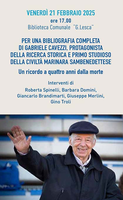 SAN BENEDETTO DEL TRONTO – Per la serie di incontri intitolata “Il Circolo in Biblioteca” che prosegue nelle sede della Biblioteca comunale “G.Lesca”, venerdì 21 febbraio alle ore 17, nella ricorrenza dei quattro anni dal giorno della scomparsa di Gabriele Cavezzi, storico della città e Premio Truentum, il Circolo dei Sambenedettesi ha deciso di dedicargli la giornata e ricordare il contributo culturale che ha dato al Circolo e all’intera città. «Gabriele Cavezzi e tutta la sua opera meritano un tributo di memoria e di riconoscenza nella casa dei libri che in vita ha frequentato con assiduità e amore per gli studi. – affermano dal Circolo dei Sambenedettesi – Lo faremo con un incontro-convegno intitolato “Per una bibliografia completa di Gabriele Cavezzi, protagonista della ricerca storica e primo studioso della Civiltà Marinara Sambenedettese. Un ricordo a quattro anni della morte” che vede, dopo il saluto delle autorità comunali, gli interventi di Roberta Spinelli, direttrice della Biblioteca; Stefano Cavezzi, Barbara Domini, Giancarlo Brandimarti, Giuseppe Merlini, Gino Troli». Il Circolo dei Sambenedettesi con questa iniziativa, organizzata insieme alla Biblioteca Lesca con il patrocinio dell’Assessorato alla Cultura del Comune di San Benedetto, intende così ricordare la figura di Cavezzi e il suo molteplice impegno, ma anche sottolineare la necessità di avviare un’azione di raccolta unitaria dell’opera che deve trovare finalmente un’edizione completa e accurata della sua ricchissima produzione storiografica sparsa in libri, riviste e periodici locali.