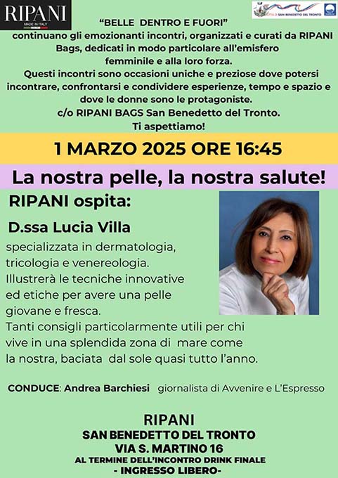 SAN BENEDETTO DEL TRONTO – Ripani Bags rinnova la sua stagione proponendo gli appuntamenti culturali dedicati al pianeta femminile. Nasce tutto da un’idea dell’azienda della famiglia abruzzese che a San Benedetto ha deciso d’investire per valorizzare le risorse del territorio. Sabato 1 marzo alle ore 16.45, presso lo shop di via San Martino, sarà la volta di Lucia Villa, dermatologa attiva anche nel campo sociale, che illustrerà le tecniche innovative della cura della pelle, l’etica per una migliore salute del proprio corpo e le vie di accesso alla professione medica che deve essere tutelata maggiormente. L’ingresso è libero e al termine sarà vivacizzato da un aperitivo offerto dall’azienda Ripani. L’incontro, condotto dal giornalista Andrea Barchiesi, è patrocinato dal Comune di San Benedetto del Tronto.
