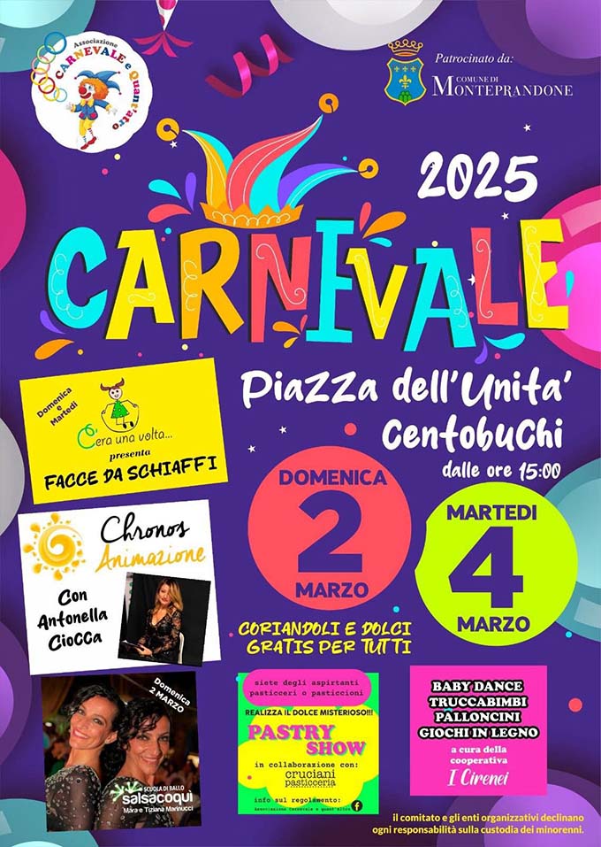 MONTEPRANDONE – L’associazione “Carnevale e quant’altro”, con il patrocinio e il sostegno del Comune di Monteprandone, organizza il Carnevale 2025: due giorni di festa in piazza dell’Unità a Centobuchi. Due pomeriggi spumeggianti quelli di domenica 2 e martedì 4 marzo, con animazione, baby dance, truccabimbi, balloon art, lego maxi, gonfiabili interattivi, laboratori creativi e maxi giochi in legno a cura della cooperativa sociale “I Cirenei”. Domenica 2 marzo ci sarà un momento dedicato alla dolcezza  organizzato in collaborazione con la Pasticceria Cruciani di Centobuchi. Gli aspiranti pasticceri o “pasticcioni”, possono iscriversi  al “Pastry Show” per realizzare in piazza insieme il dolce misterioso. Per informazioni: pagina facebook “Associazione Carnevale e quant’altro” . In tutti e due i giorni l’associazione “C’era una volta” presenta “Facce da schiaffi”, una piccola rappresentazione teatrale, mentre nella giornata di domenica, dopo la rappresentazione seguirà l’animazione della scuola di ballo “Salsa Coquì”.