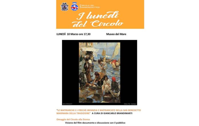 SAN BENEDETTO DEL TRONTO – Proseguono lunedì 10 marzo, alle ore 17.30, gli appuntamenti nell’ambito de “I Lunedì del Circolo” nella Sala Incontri del Museo del Mare. Il Circolo dei Sambenedettesi, in occasione della Festa della Donna e nell’ambito della programmazione dell’Assessorato alla Cultura per “Marzo è Donna”, fa un omaggio al ruolo che la figura femminile ha svolto nella civiltà marinara sambenedettese sia in relazione al lavoro che nella vita familiare. A cura di Giancarlo Brandimarti verrà presentato il docufilm “Le matriarche e i freché. Infanzia e matriarcato nella San Benedetto marinara della tradizione” prodotto dal Circolo dei Sambenedettesi. Si tratta di una ricostruzione storica ricca di immagini e documenti realizzata con lo scopo di lasciare una testimonianza concreta del contributo femminile alla vita e al lavoro della San Benedetto del passato. Il circolo invita la cittadinanza a partecipare per conservare la memoria del rilievo che la donna ha avuto nel suo cammino di cambiamento e sviluppo.