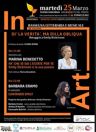 SAN BENEDETTO DEL TRONTO – Continua la VII edizione della rassegna letteraria e musicale In Art, elegante kermesse organizzata dall’Associazione culturale Rinascenza, ideata da Annalisa Frontalini, che cura anche la direzione artistica. Appuntamento martedì 25marzo, ore 20.45, al Teatro Concordia di San Benedetto del Tronto con laserata intitolata “Dì la verità, ma dilla obliqua”, un omaggio a Emily Dickinson che vedrà susseguirsi sul palco l’attrice, autrice, traduttrice e acting coach Marina Benedetto e la cantante e autrice Barbara Eramo. A inaugurare la serata sarà la giornalista e autrice Elvira Apone, che introdurrà l’evento. Marina Benedetto proseguirà con l’incontro “Fa’ che io sia l’estate per te”, dedicato a Emily Dickinson e la sua poesia. Testi e letture a cura di Marina Benedetto. La serata proseguirà alle ore22 con il concerto “Cantando Emily”,un progetto discografico dedicato a Emily Dickinson. Sul palco saliranno Barbara Eramo (voce, ukulele, electronics), Andrea D’Apolito (chitarra acustica, harmonium, cori) ed Emanuele Bultrini (chitarra elettrica). L’Associazione culturale Rinascenza ringrazia gli sponsor e il Comune di San Benedetto del Tronto per il patrocinio. L’ingresso è libero. É gradita un’offerta consapevole. Informazioni e prenotazioni, dopo le ore 18, al numero: 3394211362.