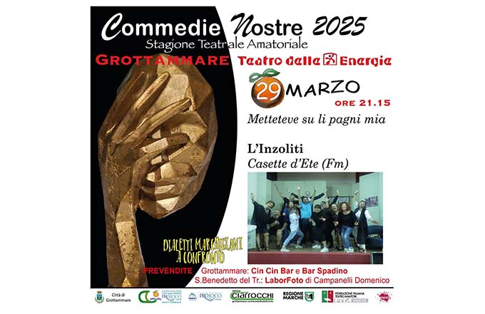 GROTTAMMARE – Sabato 29 marzo alle ore 21.15 al Teatro delle Energie di Grottammare, va in scena il sesto appuntamento della fortunata Rassegna di teatro dialettale amatoriale “Commedie Nostre” con “Mettetevi su li pagni mia” di Angelo Cippitelli e Paolo Felici, interpretata dalla Compagnia Teatrale “L’Inzoliti” di Casette d’Ete con la regia di Giorgio Rossi. La trama: siamo a metà degli anni ’90, dove Giuseppe Fucetti è un imprenditore calzaturiero di origine contadina vecchio stampo, sempre intento a cercare di far quadrare i conti familiari, prendendosela con i figli un pò scansafatiche e la moglie, perché, a loro modo, troppo spendaccioni. La sua esistenza viene sconvolta quando, per un errore diciamo, di gioventù, “deve” far sposare presto sua figlia con il fidanzato, per non far fare delle chiacchiere a tutto il paese, trovandosi suo malgrado, a scendere a compromesso e a dover spendere parecchi soldi. Ma per amore dei figli, si sa, tutto si fa. Poi arriva il giorno del matrimonio dove… ne vedremo delle belle! Una commedia sicuramente divertente visto il curriculum della compagnia elpidiense e soprattutto ricordando la simpatica commedia dell’anno scorso. Questi gli interpreti: Giorgio Rossi, Gessica Parrucci, Benedetta Betti, Massimo Vita, Francesco Viti, Laura Eusebi, Michele Berdini, Francesca Gallucci, Luca Tidei, Vittorio Pagliaretta, Alessia Lattanzi, Benedetta Iacchelli e Marianna Iacchelli. Suggeritrice Sara Malaspina, Aiuto regia Francesco Viti e Service a cura di Zoma Service di Maurizio Zocchi. A presentare la serata sarà la grottammarese madrina della rassegna Alessandra Mora, mentre il siparietto poetico sarà a cura della poetessa, altrettanto grottammarese, Ermanna Zarroli. Organizzazione a cura dell’Associazione Lido degli Aranci Aps Proloco in collaborazione con l’Amministrazione Comunale. Infoline: 335 6234568. Ingresso 10 euro. Prevendite abituali al Cin Cin Bar e Bar Spadino di Grottammare e al Labor Foto di Domenico Campanelli a San Benedetto del Tronto.