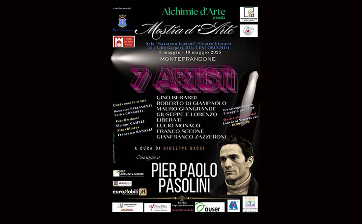MONTEPRANDONE – Ripartono gli eventi di Alchimie d’Arte, con i nuovi appuntamenti in prossimità dell’estate. Il via avverrà con una mostra d’arte itinerante dedicata al ricordo di Pier Paolo Pasolini – poeta, scrittore, regista, sceneggiatore, attore e drammaturgo italiano – a cinquant’anni dalla sua scomparsa. L’inaugurazione, a cura del prof. Giuseppe Bacci, é prevista sabato 3 maggio, alle ore 17.30, nella Sala Espositiva “Nazareno Luciani” presso il GiovArti di Centobuchi (via A. De Gasperi). La mostra terminerà il 18 maggio. A presentare la serata Domenico Parlamenti, presidente Alchimie d’Arte, ed Enrica Consorti, responsabile artistica di Alchimie d’Arte. La voce narrante sarà quella di Simone Cameli, mentre Francesco Ranalli eseguirà brani per chitarra tratti dal repertorio classico. Gli artisti presenti: Giuseppe e Lorenzo Liberati, Gino Berardi, Gianfranco Zazzeroni, Franco Secone, Roberto Di Giampaolo, Lucio Monaco, Mauro Giangrande. La mostra si avvale del Patrocinio del Comune di Monteprandone e la collaborazione dell’Avis e Auser Monteprandone, degli sponsor Code Service di Lino Damiani e Farmacia San Giacomo di Fabrizio Roncarolo. Nella serata sarà ricordata con filmati e foto, la presenza di Pier Paolo Pasolini a San Benedetto allo stadio Ballarin, dove disputò una partita di calcio – lui era amante di questo sport e quella è stata la sua ultima partita – con le vecchie glorie Rossoblù della Sambenedettese il 14 settembre 1975, un mese e mezzo prima della sua morte, avvenuta il 2 novembre. La mostra ha già ottenuto un meritato successo a Roma, nella sala Carlo D’Orta studio e pubblicata nell’importante rivista Exibart.com. Nell’ambito della durata dell’esposizione ci saranno due eventi culturali. Venerdì 9 maggio alle ore 18 con la psicoterapeuta ed esperta in criminologia Antonella Baiocchi, con la sua ultima opera “Abusi sui minori” (ediz. Alpes) e domenica 11 maggio la scrittrice Nadia Mari che presenterà il suo saggio “Il potere nascosto delle donne, da Crisalidi a Farfalle” (ediz. Il filo di Arianna), il libro si avvale della prefazione di Virginia Raggi ex sindaca di Roma. Ingresso libero per tutti gli appuntamenti. Info e prenotazioni: 3285546583.