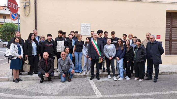 GROTTAMMARE – Studenti, docenti, istituzioni e familiari insieme per una commemorazione partecipata e toccante quella che si è svolta il 24 aprile a Grottammare, in occasione dell’80° anniversario della Liberazione. Al centro della cerimonia, il ricordo di Natale Capriotti, partigiano e martire della Resistenza, fucilato dai nazifascisti il 26 marzo 1944 dopo atroci torture. Presenti all’iniziativa anche alcuni componenti della famiglia, i nipoti Angelo e Carlo e la pronipote Nausica, che hanno partecipato con profonda emozione fino al momento conclusivo dello svelamento della lapide celebrativa. La targa è collocata sul lato est della Biblioteca comunale, lungo la via intitolata al partigiano, teatro questa mattina di un racconto urbano a tappe: un esempio concreto di public history, nato su impulso dell’assessore alla Crescita culturale Lorenzo Rossi, con il supporto storico di Gianluca Traini e la collaborazione della professoressa Rossella Malaspina.