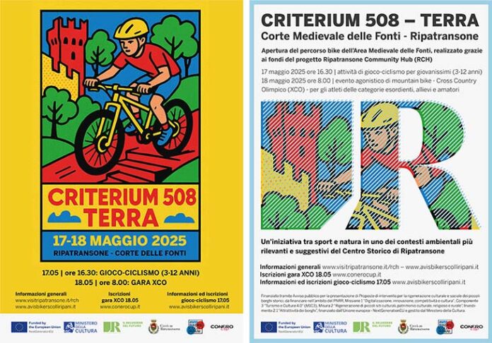 RIPATRANSONE – Domenica 18 maggio, con inizio alle ore 8 presso la Corte Medievale delle Fonti di Ripatransone, si svolgerà Criterium 508 – Terra, evento agonistico di mountain bike (XCO) riservato ad agonisti, promosso da Avis Bikers dei Colli Ripani in collaborazione con Conero Cup, nell’ambito del progetto Ripatransone Community Hub (RCH) del Comune di Ripatransone. L’evento è riservato a categorie agonistiche ed è gratuito. Il tracciato di gara si sviluppa lungo un percorso ad anello che, con partenza dalla Corte Medievale delle Fonti, attraversa il nuovo circuito dell’Area Lupidi – realizzato grazie ai fondi del progetto RCH – e tocca importanti aree storiche e naturalistiche del territorio. Nel pomeriggio di sabato 17 maggio, alle ore 16:30, presso la Corte Medievale delle Fonti di Ripatransone, è in programma un’attività gratuita di gioco-ciclismo per giovanissimi, aperta a tutto il pubblico, pensata per avvicinare i più piccoli al mondo della bicicletta e alla scoperta del paesaggio locale. Il Criterium 508 – Terra si inserisce nel percorso di valorizzazione culturale, ambientale e sociale del territorio promosso da Ripatransone Community Hub, con l’obiettivo di rafforzare l’identità della comunità e promuovere forme di partecipazione attiva attraverso iniziative inclusive e sostenibili.