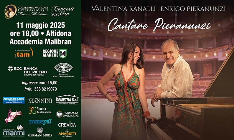 ALTIDONA – Per Malibran Jazz da non perdere, domenica 11 maggio alle ore 18, il l’appuntamento con “Cantare Pieranunzi”, un concerto che vedrà protagonisti Valentina Ranalli (voce e testi) ed Enrico Pieranunzi (pianoforte e musica). “Cantare Pieranunzi” è il quarto appuntamento in cartellone nell’ambito dei “Concerti Oro” dell’Accademia Malibran, ed è un evento che celebra le composizioni del grande Maestro italiano. «Come direttrice artistica – afferma Rossella Marcantoni che ha portato, è bene ribadirlo, l’Accademia Malibran a vette internazionali – sono profondamente emozionata nel vedere come i capolavori del Maestro Pieranunzi si trasformino in nuove canzoni grazie ai testi evocativi e alla splendida voce di Valentina Ranalli. Questo percorso di creatività e sensibilità arricchisce il nostro progetto, portando alla luce l’anima autentica di ogni composizione e offrendo al pubblico un’esperienza unica e coinvolgente. Si tratta di un’occasione imperdibile per scoprire come le melodie di uno dei più grandi jazzisti italiani si arricchiscono di nuove interpretazioni, portando in scena la magia di un artista che ha lasciato un’impronta indelebile nel jazz internazionale».