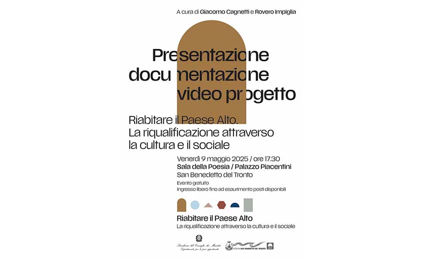 SAN BENEDETTO DEL TRONTO – Venerdì 9 maggio alle ore 17.30, nella Sala della Poesia di Palazzo Piacentini, si terrà la presentazione della documentazione video del progetto “Riabitare il Paese Alto – La riqualificazione attraverso la cultura e il sociale”, a cura di Giacomo Cagnetti e Rovero Impiglia. L’incontro sarà un’occasione per approfondire i contenuti e il processo creativo che ha portato alla realizzazione del documentario “Il Bacio del Mare” e delle clip video abbinate alle 24 fotografie esposte nell’omonima mostra al Paese Alto (aperta al pubblico fino al 2 giugno), realizzati in collaborazione con il Circolo dei Sambenedettesi e l’Archivio Storico comunale. Sarà inoltre presentato un secondo documentario dedicato ai diversi poli del Museo del Mare di San Benedetto del Tronto. Durante l’evento, i due autori e i protagonisti dei video, condivideranno con il pubblico il dietro le quinte di una narrazione visiva articolata e partecipata, capace di raccontare e valorizzare la ricchezza storica, sociale e culturale della città. L’ingresso è gratuito, fino ad esaurimento posti. L’evento è parte del progetto “Riabitare il Paese Alto – La riqualificazione attraverso la cultura e il sociale”. Per ulteriori informazioni: