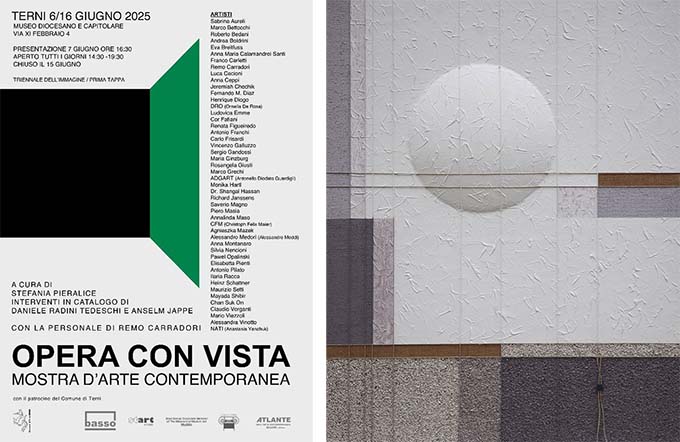 TERNI – Nel secentesco Palazzo del Seminario, a Terni, non solo icone sacre provenienti dai depositi del Capitolo, conservate nel Museo Diocesano e Capitolare diretto da Don Claudio Bosi bensì anche – dal 6 al 16 giugno – lavori di arte contemporanea esposti nella mostra “Opera con vista”, a cura di Stefania Pieralice. Una iniziativa di respiro internazionale che vede la presenza di autori provenienti da tutto il mondo: Italia, Germania, Canada, Messico, Brasile, Paesi Bassi, Russia, Austria, Repubblica del Sudan, Belgio, Polonia, Cina. Circa cinquanta gli artisti chiamati a raccontare, riprendendo le parole della curatrice “un percorso oltre i confini, non tracciati da mappe o progetti urbani; in questi luoghi di