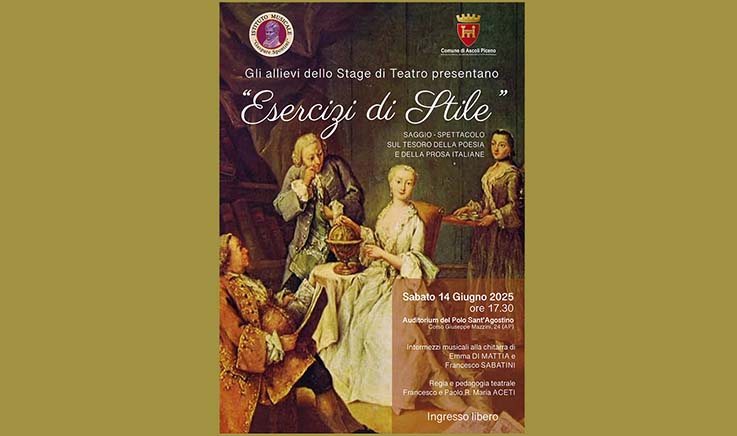 ASCOLI PICENO – Sabato 14 giugno alle ore 17.30, presso l’Auditorium del Polo Sant’Agostino intitolato al musicista Cesare Cellini, avrà luogo la Cerimonia di consegna degli attestati di frequenza finali agli allievi attori che hanno partecipato con profitto allo Stage di Teatro tenuto dai maestri Francesco e Paolo R. Maria Aceti nell’anno scolastico 2024/2025 all’interno della splendida cornice rinascimentale di Palazzo Pacifici, sede dell’Istituto Musicale “Gaspare Spontini” convenzionato con il Conservatorio Statale di Musica “Gioacchino Rossini” di Pesaro. La cerimonia sarà preceduta da un saggio-spettacolo dal titolo “Esercizi di stile” con la partecipazione degli allievi – molti dei quali giovanissimi provenienti dalle scuole di ogni ordine e grado delle province di Ascoli Piceno e Fermo – chiamati a confrontarsi con il tesoro della poesia e della prosa italiane. Interventi alla chitarra di Francesco Sabatini e Emma Di Mattia. L’ingresso è libero.