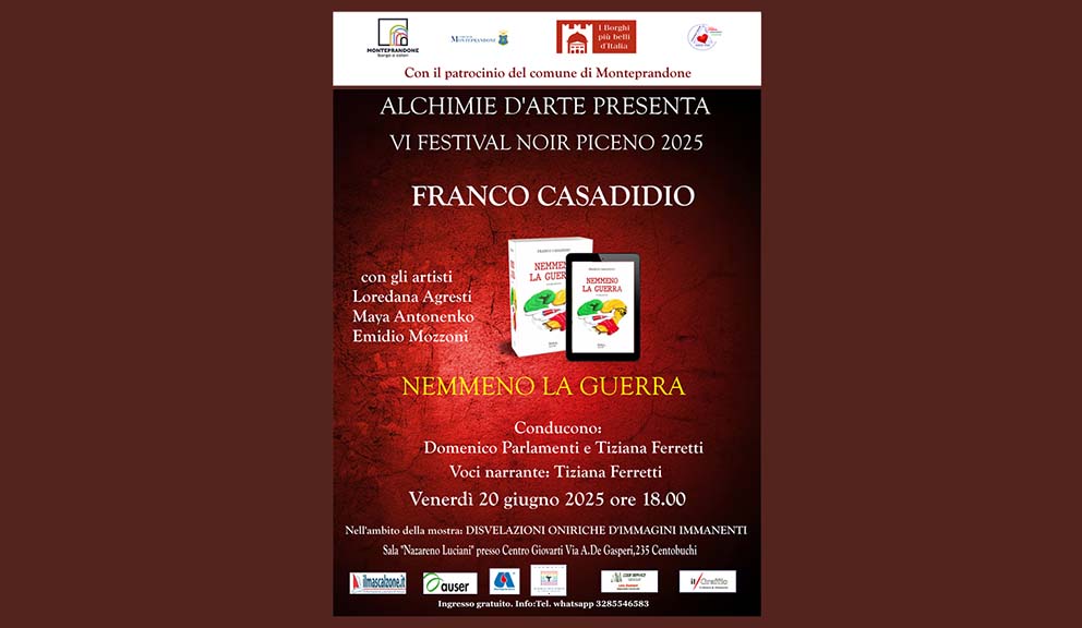 MONTEPRANDONE – Quarto incontro nell’ambito del VI Festival Noir Piceno organizzato da Alchimie d’Arte con il Patrocinio del Comune di Monteprandone, che si svolgerà venerdì 20 giugno alle ore 18 nella Sala “Nazareno Luciani”, presso il Centro Giovarti a Centobuchi (via A. De Gasperi 235). Protagonista della serata l’autore storico e sociologo Franco Casadidio che presenterà la sua ultima opera letteraria dal titolo “Nemmeno la guerra” (Drakon Edizioni). L’evento si avvale della collaborazione di Avis e Auser Monteprandone, degli sponsor Code Service di Lino Damiani e Farmacia San Giacomo di Fabrizio Roncarolo. A presentare la serata Domenico Parlamenti presidente Alchimie d’Arte e Tiziana Ferretti, che sarà anche la voce narrante. Esporranno le loro opere gli artisti Loredana Agresti, Maya Antonenko, Emidio Mozzoni. Si potrà visitare anche la mostra d’arte all’interno della Sala, “Disvelazioni oniriche d’immagini immanenti”, pitture e sculture di grandi artisti. L’ingresso è gratuito. Info:3285546583.