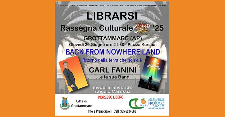 GROTTAMMARE – Giovedì 26 giugno alle ore 21.30 in Piazza Kursaal a Grottammare ci sarà la presentazione del libro del cantante Carl Fanini, “Back from Nowhere Land”, che apre il ciclo estivo di “Librarsi”, rassegna culturale della Pro Loco Lido degli Aranci rivolta ai tanti autori di libri locali. Infatti è da poco terminata la sessione primaverile con gli autori Diego Cola, Raffaella Caponi ed Ermanna Zarroli con un successo davvero inaspettato in un crescendo di emozioni, divertimento, suspence e cultura. Continua così la fortunata scia che, da qualche anno, differenzia il lavoro quarantennale della Lido votata al cabaret e all’intrattenimento con un filone diverso dal solito ma sempre più apprezzato e ampiamente riconosciuto.