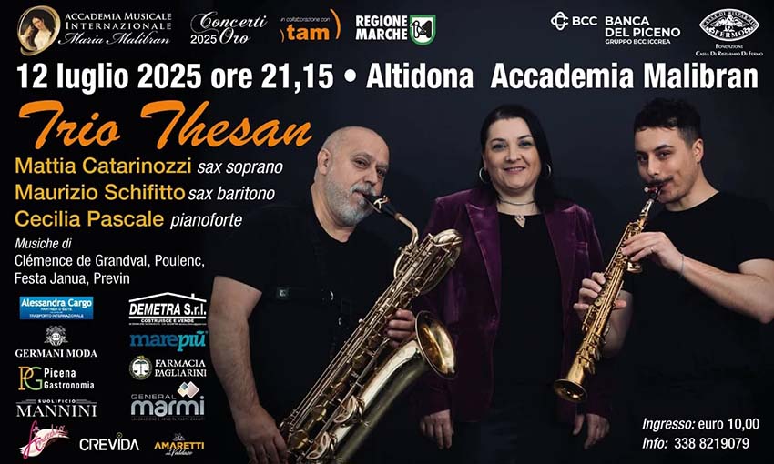 ALTIDONA – Il prossimo imperdibile evento varato dall’Accademia Malibran è in programma sabato 12 luglio alle ore 21.15, con il Trio Thesan composto da Mattia Catarinozzi, sax soprano; Maurizio Schifitto, sax baritono; Cecilia Pascale, pianoforte. Musiche di Clémence de Grandval, Poulenc, Festa Janua, Previn. Ingresso 10 euro. Info e prenotazioni: 338.8219079. Thesan è una dea etrusca dell’alba e della genesi della vita. Un nome impegnativo come è impegnativo il concerto che proporranno. «La scelta di ospitare il Trio Thesan – spiega con orgoglio Rossella Marcantoni, direttrice artistica dell’Accademia Malibran – rappresenta un investimento nella qualità e nell’innovazione musicale, offrendo al pubblico un’esperienza unica che unisce la raffinatezza della musica classica alla freschezza delle interpretazioni contemporanee. Il programma selezionato dimostra un’attenta cura nel proporre un percorso musicale ricco di contrasti e di emozioni. La presenza di brani dal XIX secolo come il Trio de Salon di de Grandval, accanto a composizioni recenti di Fabrizio Festa e André Previn, sottolinea l’impegno dell’Accademia nel valorizzare un dialogo tra passato e presente, tra tradizione e sperimentazione».