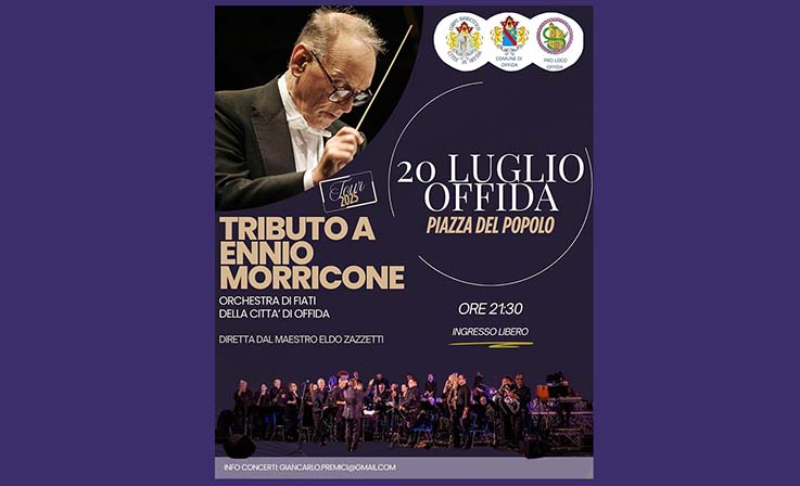 OFFIDA – “Io penso che quando, fra cento duecento anni, vorranno capire com’eravamo, è proprio grazie alla musica da film che lo scopriranno.” Le parole del Premio Oscar Ennio Morricone, scomparso nel 2020, risuonano, quanto la sua musica, ai nostri giorni. E una serata all’insegna della musica sarà quella di domenica 20 luglio in Piazza del Popolo alle ore 21:30 quando si esibirà l’Orchestra di fiati Tributo Ennio Morricone di Offida in un concerto dedicato alle più belle colonne sonore cinematografiche del celebre e compianto Maestro italiano. L’orchestra diretta dal M° Eldo Zazzetti, composta da 50 musicisti, è protagonista di un’attività concertistica in cui alterna un repertorio molto vario, dalla musica tradizionale per banda, al patrimonio operistico fino alle interpretazioni di colonne sonore dei film, come quelle di Morricone che regaleranno al pubblico intense emozioni per capolavori assoluti e indimenticabili. La scaletta del concerto vede l’inserimento di molti titoli: Playing Love, Mission, Cinema Paradiso, C’era una volta in America, Gli intoccabili, Sahara dreams, Mesa verde – Giù la testa, Come una sentenza, C’era una volta il West, A Fistful of Dollars, A Morricone portrait, Il buono il brutto e il cattivo, L’estasi dell’oro, Se telefonando. Nel corso della serata “Omaggio al cinema” verranno eseguiti Gladiator, Will Always Love You (La guardia del corpo), My Heart Will Go On (Titanic) e The imperial march (Guerre stellari). Ospiti speciali le vocalist Valeria Svizzeri e Valentina Corradetti; ad accompagnare il pubblico i presentatori Marica Cataldi, Sara Capretti e Mauro Moretti.