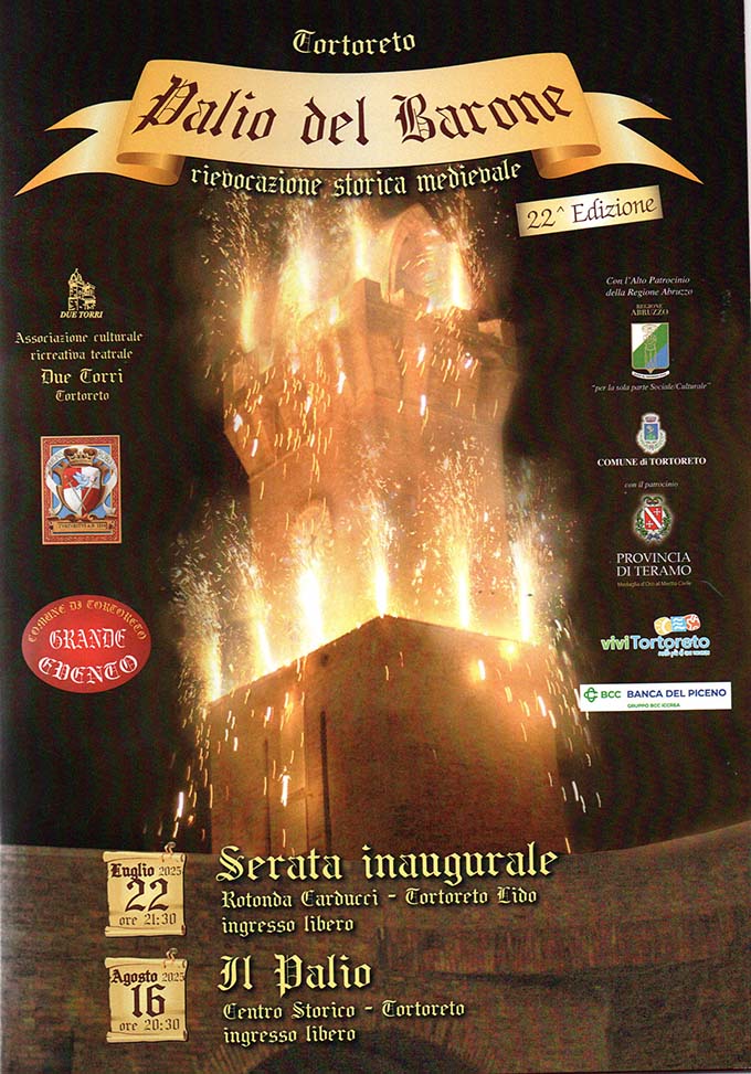 TORTORETO –  Presentata la XXII edizione del Palio del Barone con l’importante novità di essere stato inserito nel progetto “Mappatura delle rievocazioni storiche” ideato e condotto dall’Istituto Centrale per il Patrimonio Immateriale (ICPI) del Ministero della Cultura, con la collaborazione della Società Italiana per la Museografia e i Beni DEA (SIMBDEA). L’evento si svolgerà martedì 22 luglio, ore 21,30, al centro del lido alla Rotonda Carducci e sabato 16 agosto, ore 20, nel cuore del centro storico nella parte alta. Ideato ed organizzato dall’Associazione culturale “Due Torri”, gode dell’alto patrocinio e sostegno finanziario del Comune di Tortoreto (come Grande Evento), Regione Abruzzo, Banca del Piceno ed i numerosissimi sponsor ed il patrocinio della Provincia di Teramo. Il drappo, realizzato dall’artista Carina Pieroni di San Benedetto del Tronto, verrà conteso tra le due contrade storiche rivali: Terranova in vantaggio di 11 drappi vinti contro i 10 di Terravecchia.