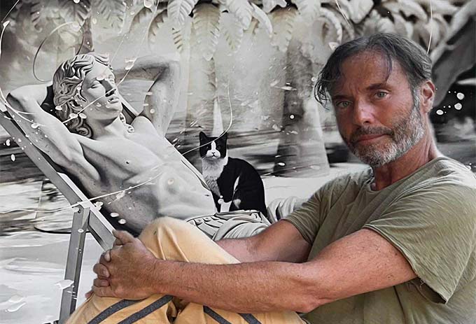 Il Santo appare nell’opera di Consorti come una statua animata che si muove nello scenario di una San Benedetto i cui simboli sono raccontati con devozione e ironia. San Benedetto è rappresentato in primo luogo come patrono dell’accoglienza e della solidarietà. Nell’immagine manifesto della mostra è attorniato da bambini bianchi e neri che lo accompagnano in una traversata gioiosa delle vie cittadine, tra le palme, con i gatti del molo sud e i pesci nella cesta della bici. Irriverente? No, vero. San Benedetto racconta l’anima del luogo, tra solidarietà, tradizioni, devozione e apertura verso il futuro. In altre immagini il Santo appare come un’icona moderna in una tempesta psichedelica tra le palme e con la famosa gatta Mamy del molo sud in mano, in un tempo eterno e siderale. Bellezza pop e cristiana insieme, in un equilibrio che non intende dissacrare ma trovare lo spazio del sacro nel presente. E ancora San Benedetto, bellissimo, che surfa per salvare i bimbi dalle onde del mare, è un invito a riscoprire il sacro nel donarsi all’altro, nella scelta di vivere superando gli egoismi.