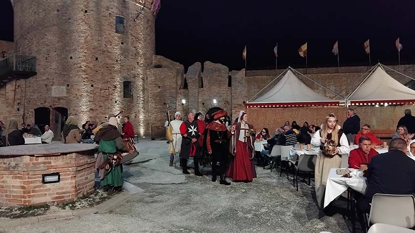 ACQUAVIVA PICENA – Con il maestoso Banchetto Nuziale Medievale all’interno della Fortezza di Acquaviva Picena, domenica 3 agosto si è conclusa la XXXVIII edizione di “Sponsalia”, celebre rievocazione storica che per il borgo acquavivano rappresenta l’evento fiore all’occhiello dell’estate. L’Ente Associazione Palio del Duca Aps è soddisfatta dell’edizione 2025 che si è appena conclusa con un bilancio più che positivo: cena medievale sold out e prime tre serate accolte con entusiasmo dai numerosi partecipanti.  Dopo la serata di giovedì, durante la quale è stato rievocato il fidanzamento dei rampolli delle nobili famiglie degli Acquaviva e dei Brunforte, Forastèria e Rinaldo, è stata la volta della serata di venerdì 1 agosto. Durante questa seconda serata i presenti hanno assistito al matrimonio simbolicamente celebrato in piazza del Forte, dopodiché si è dato il via ai giochi medievali che hanno visto il rione Aquila vincere sul rione Civetta e portare a casa il Palio istoriato da Giancarlo Costanzo. Il pomeriggio di sabato 2 agosto è stato dedicato ai “Ludi di Sponsalia”, spettacoli per bambini, i quali hanno partecipato numerosi insieme alle loro famiglie. Domenica 3 agosto, nonostante il meteo incerto, all’interno della Fortezza di Acquaviva si è svolto il Banchetto Medievale.
