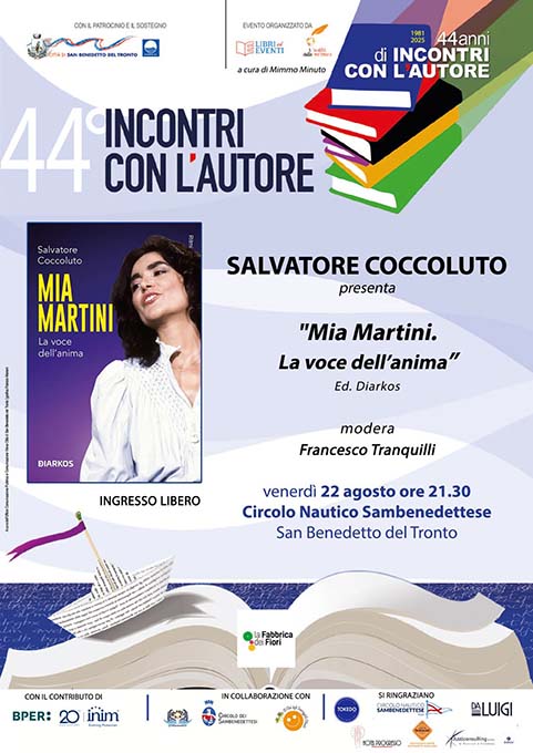 SAN BENEDETTO DEL TRONTO – La rassegna “Incontri con l’Autore”, giunta alla sua 44ª edizione, accoglie venerdì 22 agosto alle ore 21.30 al Circolo Nautico Sambenedettese lo scrittore e critico musicale che presenterà il suo nuovo libro “Mia Martini. La voce dell’anima” (Diarkos). L’incontro sarà introdotto dal presidente dell’associazione “I Luoghi della Scrittura” Mimmo Minuto e moderato da Francesco Tranquilli. Coccoluto, già autore di saggi dedicati a grandi protagonisti della musica italiana come Lucio Dalla, Gianna Nannini, Pino Daniele e Franco Califano, ricostruisce con questo volume la parabola artistica e umana di Mia Martini, una delle voci più intense e struggenti della nostra canzone. Nel libro si ripercorrono i suoi inizi, i trionfi degli anni Settanta, il doloroso periodo di isolamento professionale e il ritorno sulle scene con Almeno tu nell’universo, brano destinato a diventare immortale. Ampio spazio è dedicato anche al rapporto con la sorella Loredana Bertè, segnato da conflitti ma anche da momenti di profonda vicinanza, e alle ingiustizie che hanno segnato la vita della cantante. Grazie a interviste esclusive a musicisti e produttori che l’hanno accompagnata, l’autore offre un ritratto corale e autentico di una donna che ha trasformato il dolore in arte. «Mia Martini è stata una voce dell’anima, capace di dare vita a canzoni che rimangono scolpite nella memoria collettiva», afferma Coccoluto, sottolineando come la sua figura continui a ispirare nuove generazioni di artisti e appassionati. La rassegna è organizzata dall’associazione I Luoghi della Scrittura e dalla libreria Libri ed Eventi, con il patrocinio del Comune di San Benedetto del Tronto e il contributo di BPER Banca e Inim. Collaborano inoltre l’associazione Pelasgo, il Circolo dei Sambenedettesi, il Club degli incorreggibili ottimisti, la società Tokedo e la cooperativa La Fabbrica dei Fiori.