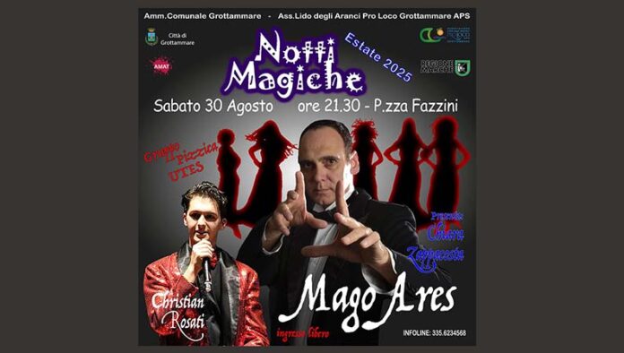 GROTTAMMARE – Ultimo appuntamento per “Notti Magiche” 2025, sabato 30 agosto ore 21.30, in piazza Fazzini a Grottammare. Dopo il successo di domenica scorsa con Gianfranco Phino, DanzArte Cris Academy di Cristina Orsini e del bambino prodigio Leonardo Pallini, ora è la volta di Mago Ares accompagnato dal balletto “pizzicoso” dell’Utes e dal talento grottammarese Christian Rosati. Presenta Chiara Zappacosta. Una chiusura con il botto per la Pro Loco di Grottammare l’Associazione Lido degli Aranci a termine di una stagione estiva veramente esaltante, gratificante ma che è solo il preludio di un futuro ricchissimo di altre novità. Mago Ares è uno tra i più bravi artisti del panorama magico italiano: specializzato in numeri di grandi magie riesce a tenere incollato il pubblico in uno spettacolo entusiasmante pieno di sorprese, colori e colombe che appaiono dal nulla, coadiuvato dalla sua insostituibile assistente che magicamente scomparirà dai vostri occhi. L’ingresso è libero.