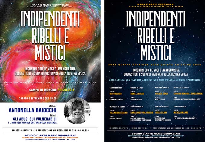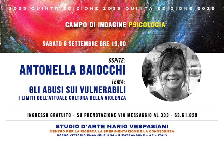 RIPATRANSONE – Il percorso tracciato dalla rassegna “Indipendenti, Ribelli e Mistici” è a tutti gli effetti un viaggio coerente e audace nel cuore del nostro tempo. Dopo aver costruito le fondamenta del pensiero con la filosofia, esplorato i mondi interiori con la letteratura e il mito, immaginato spazi ideali del vivere con l’architettura, affrontato la medicina partendo da Ippocrate e la spiritualità tra oriente ed occidente, la rassegna di Mara e Mario Vespasiani si appresta ora ad affrontare un altro delicato aspetto della nostra società. Sabato 6 settembre, con l’apertura della sezione dedicata alla Psicologia, lo Studio d’Arte di Ripatransone accoglierà la dottoressa Antonella Baiocchi, che grazie alla sua lunga esperienza affronterà una discussione dal titolo tanto urgente quanto ineludibile: “Gli abusi sui vulnerabili, i limiti dell’attuale cultura della violenza”.