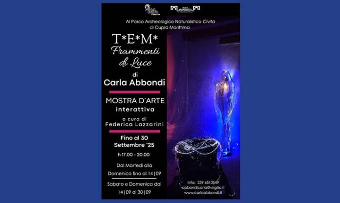 CUPRA MARITTIMA – Al Parco Archeologico Naturalistico Civita di Cupra Marittima è aperta l’esperienza d’arte interattiva dell’artista Carla Abbondi. La mostra “T*E*M*, Frammenti di Luce” rappresenta l’ultima parte della trilogia che l’artista ha presentato al Palazzo dei Priori di Fermo con “l’Ottava Nota” e presso il Polo Museale San Francesco di Montefiore dell’Aso con “Il Tempo di un battito d’Ali”. T*E*M* rimanda all’antica lingua indoeuropea e letteralmente significa “Frammenti di Luce”, da cui deriva la parola Tempo. Il Parco Archeologico risulta essere una cornice ideale e suggestiva per le opere esposte, in quanto i reperti archeologici rinvenuti rappresentano anch’essi dei frammenti che fanno luce sulla nostra storia. Il visitatore viene coinvolto in un’esperienza immersiva, in connessione con le proprie emozioni e i temi esplorati sono tempo, luce e suono. L’artista Carla Abbondi, che si autodefinisce “artificiera”, da anni espone in Italia e nel mondo e in permanenza nell’Atelier di Porto San Giorgio. La mostra è visitabile fino al 30 settembre, presso il Parco Archeologico Naturalistico Civita, dalle ore 17 alle ore 20, dal martedì alla domenica fino al 14 settembre e successivamente solo sabato e domenica. L’ingresso è libero.