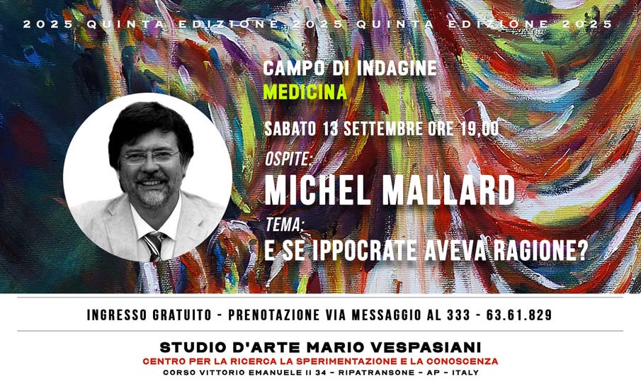 RIPATRANSONE – Dopo una serie di appuntamenti che hanno attraversato le fondamenta della filosofia, il fuoco della letteratura, le utopie dell’architettura, gli abissi dell’antropologia e le vette della spiritualità, la rassegna “Indipendenti, Ribelli e Mistici” presso lo Studio d’Arte di Mario Vespasiani (Corso Vittorio Emanuele II 34)  si trasforma in un’agorà dove l’arte e la sapienza medica si incontrano per rispondere a una domanda tanto antica quanto radicalmente attuale. Sabato 13 settembre, alle ore 19, il medico olistico Michel Mallard, replicherà la conferenza del 30 agosto – che ha registrato il tutto esaurito – dal titolo emblematico: “E se Ippocrate aveva ragione?”. Punto nodale di un percorso che dall’inizio, ha avuto come fine ultimo l’integrità e con essa la salute dell’essere umano nella sua totalità. Un tema di grande interesse ed attualità che non fa che confermare la rassegna come un unicum nel panorama nazionale, un laboratorio di pensiero olistico e un luogo dove, come nell’antica Grecia, la divisione tra le discipline vuole essere superata in nome di una visione unificata dell’uomo. In questo, si può ritrovare anche la missione di Vespasiani, in quanto egli non si limita a creare opere, ma, come Ippocrate, stabilisce una “deontologia” per l’artista del nostro tempo, definito dal ruolo e dall’impegno, rivolti al “benessere collettivo”. Ecco perché questa rassegna è diventata un punto di riferimento, perché è un luogo in cui non si parla solo di cultura, ma si pratica una vera e propria “medicina” dell’anima. È il “Corpus Hippocraticum” dello spirito, un compendio in cui ogni incontro affronta un fattore della nostra identità: la cura dell’anima (la letteratura, la filosofia), l’ambiente in cui viviamo (l’architettura), la voglia di bene (il desiderio) il fascino della conoscenza (il mito). La crescente rilevanza della rassegna “Indipendenti, Ribelli e Mistici” risiede dunque in questa sua unicità: essere un laboratorio di sintesi e di osservazione lucida del nostro tempo, unendo sapientemente le varie arti verso un sempre maggiore benessere umano ed una progressiva consapevolezza. Ingresso gratuito e su prenotazione. Prenotazione posti tramite messaggio al 333.6361 829. Si richiede la puntualità: per rispetto dei relatori e del pubblico, dopo 10 minuti di ritardo i posti prenotati, verranno riassegnati.