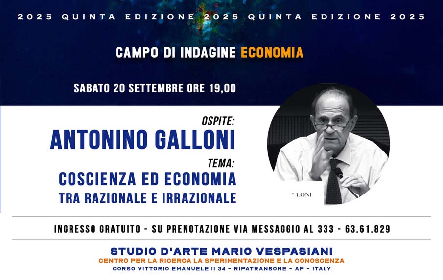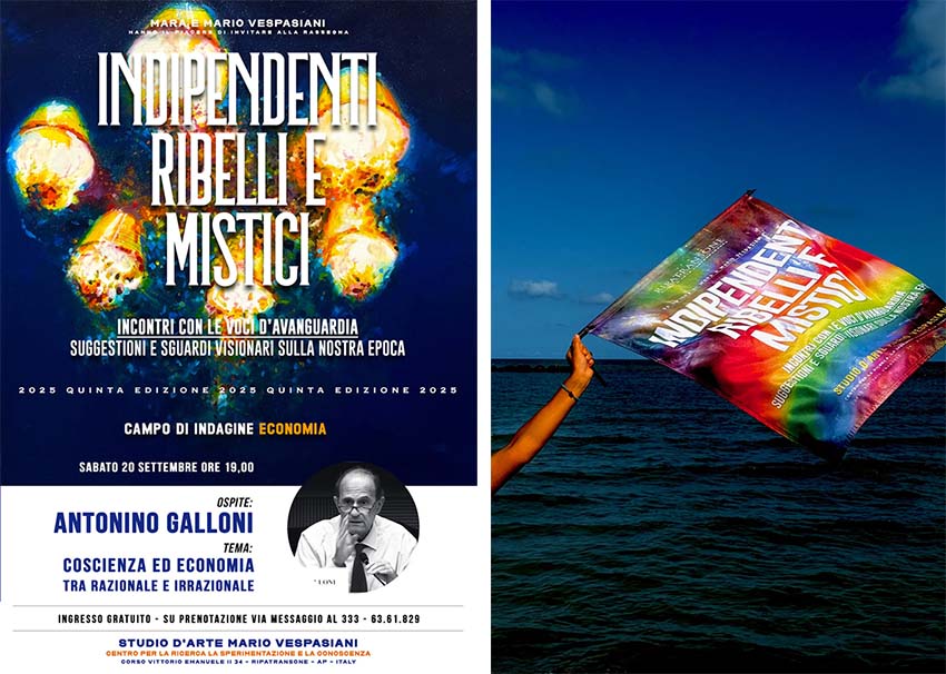 RIPATRANSONE – Il percorso tracciato dalla rassegna “Indipendenti, Ribelli e Mistici” anche in questa quinta edizione ha condotto il suo pubblico verso soglie di consapevolezza sempre più ampie e integrate. Dopo aver esplorato le fondamenta del pensiero, il fuoco della creatività, le utopie dello spazio e gli abissi dell’anima, il progetto di Mara e Mario Vespasiani che punta anche a valorizzare le Marche con la cultura, si appresta ad un altro atteso appuntamento. Dopo il successo dell’incontro con il medico olistico Michel Mallard, che ha registrato il tutto esaurito al punto da necessitare una replica che ha superato le due ore e mezza, la rassegna compie il suo “salto quantico”. Sabato 20 settembre, lo Studio d’Arte Vespasiani aprirà le sue porte ad un ambito apparentemente lontano, ma in realtà cruciale: l’Economia. Ospite d’eccezione sarà Antonino Galloni, una delle menti più lucide e non conformi del panorama economico italiano, con un intervento che già dal titolo si preannuncia imperdibile: “Coscienza ed economia – tra razionale e irrazionale”. Per la rassegna un momento significativo in cui tutte le riflessioni, spirituali e culturali dell’intera stagione verranno messe alla prova sul terreno più concreto della vita collettiva: quello del flusso finanziario e delle scelte economiche che modellano la nostra società.