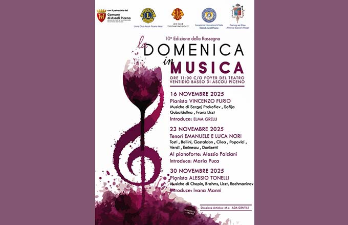 ASCOLI PICENO – Domenica 16 novembre prende il via ad Ascoli Piceno la 10^ edizione della rassegna di giovani concertisti “Domenica in Musica” curata dalla compositrice Ada Gentile. Sono in programma tre concerti, alle ore 11, al Foyer del Teatro Ventidio Basso, organizzati con il contributo dei Clubs Lions Host di Ascoli Piceno, delle Soroptimist di Ascoli Piceno e di Pierluigi ed Elisa Ambrosi Sacconi Rosati. Il primo concerto sarà affidato al pianista Vincenzo Furio, pugliese di nascita ma residente a Lucerna, vincitore del Concorso Internazionale Pianistico Maria Giubilei 2024 di Sansepolcro, il quale proporrà all’ascolto brani virtuosistici di Liszt e Prokofiev insieme alla “Ciaccona” della compositrice contemporanea russa Sofia Gubaidulina, finita nella “lista nera” del regime per la sua posizione modernista, scomparsa nel marzo scorso in Germania. Il 23 novembre sarà la volta di due giovani fratelli tenori, Emanuele e Luca Nori (entrambi ascolani ma trasferitisi in Romania, a Timisoara, nel 2009) che, con il pianista anch’esso ascolano Alessio Falciani, eseguiranno arie indimenticabili dal “Rigoletto di Verdi, dall’”Elisir d’amore” di Donizetti , insieme a brani di Bellini, Cilea, Tosti , Gastaldon ed Eminescu. La rassegna si concluderà il 30 novembre con il pianista ventiduenne Alessio Tonelli, di Grosseto, anch’egli vincitore del Concorso Pianistico Maria Giubilei di Sansepolcro, che suonerà brani di Brahms, Chopin, Liszt e Rachmaninov. I tre concerti verranno presentati rispettivamente da Elma Grelli, Maria Puca e Ivana Manni. L’ingresso è libero e sarà permesso sino all’esaurimento posti. Gli ospiti di questa rassegna sono tutti di eccellente levatura; alcuni di essi, come il violinista Giuseppe Gibboni (vincitore del Premio Paganini) ed il pianista Elia Cecino (vincitore del Premio Venezia) hanno già fatto una brillante carriera.