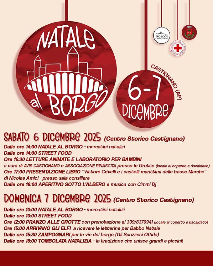 CASTIGNANO – Il centro storico di Castignano è pronto a vestirsi a festa. Sabato 6 e domenica 7 dicembre le vie del borgo torneranno a riempirsi di luci, sapori e atmosfere incantate con l’edizione 2025 di “Natale al Borgo”, organizzata dalla Pro Loco di Castignano, che ogni anno richiama famiglie, curiosi e appassionati della tradizione. Fin dal pomeriggio di sabato, a partire dalle ore 14:00, Castignano si animerà con i mercatini natalizi, un percorso tra artigianato, idee regalo e prodotti tipici, accompagnati dall’immancabile street food, che inebrierà le strade del borgo. Il pomeriggio proseguirà con iniziative dedicate ai più piccoli: alle 16:30, alle Grotte, locale coperto e riscaldato, i bambini saranno accolti da letture animate e da un laboratorio creativo a cura dell’Avis di Castignano e dell’Associazione Rinascita. Per gli amanti della cultura, nella Sala Consiliare verrà presentato il libro “Vittore Crivelli e i castelli marittimi delle basse Marche” di Nicolas Amici. E quando scende la sera, il borgo si trasforma: musica, luci e l’Aperitivo sotto l’albero danno il via a una serata in compagnia con il ritmo di Cimi Dj. Domenica il clima di festa continua fin dal mattino con la riapertura dei mercatini e dello street food. Alle Grotte sarà possibile pranzare su prenotazione con un ricco menù a soli 20 euro, mentre nel pomeriggio l’atmosfera diventa ancora più magica: arrivano gli Elfi, pronti a raccogliere le letterine dei bambini, seguiti dalla musica degli zampognari, gli “Scozzesi” di Offida, che accompagneranno i visitatori lungo le vie del centro storico. A chiudere la giornata, un classico che unisce tutti: la Tombolata Natalizia, un momento conviviale che porta allegria e tradizione. In attesa del grande weekend, venerdì 5 dicembre alle ore 19:30, presso la Chiesa di Santa Maria della Valle, verrà inaugurato il Presepe, un appuntamento speciale che dà ufficialmente il via al periodo natalizio castignanese.